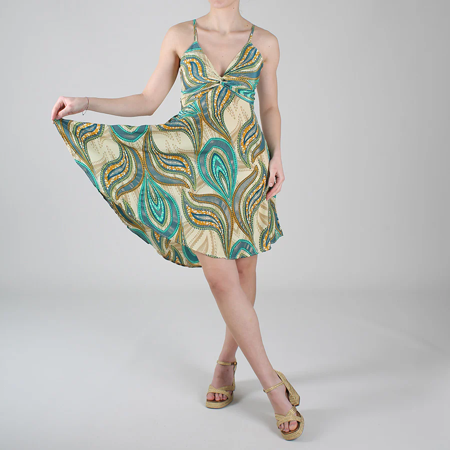 Abito corto in seta, scollo profondo a V con dettaglio nodo sul davanti, spalline sottili e regolabili, retro con fascia elasticizzata che garantisce comfort e valorizza la silhouette.
