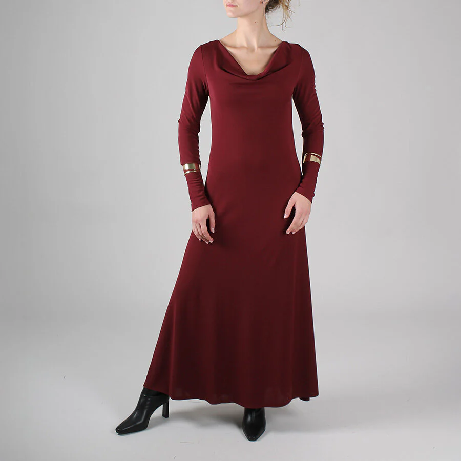 Abito lungo in tessuto fluido e scivolato. In abbinamento due bracciali rigidi oro da indossare sui polsi.