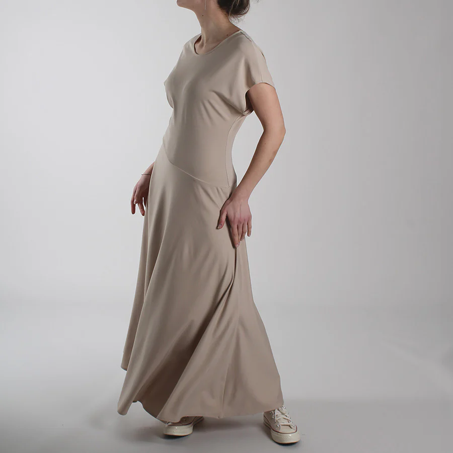 Scollo rotondo e manica corta morbida, taglio in vita con cucitura sagomata, gonna ampia, per creare movimento e comfort.