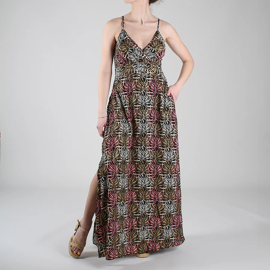 Abito lungo in seta, scollo a V incrociato sul davanti, spalline sottili regolabili e fascia elastica sul retro. Spacchetto laterale sul fondo.