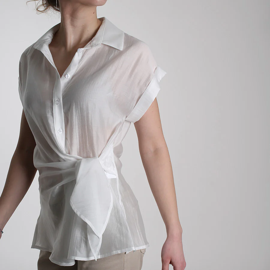 Camicia in Lyocell, leggermente trasparente. Colletto classico e chiusura frontale con bottoni, manica corta ad aletta. Nodo in vita che valorizza la silhouette e dona movimento al capo.