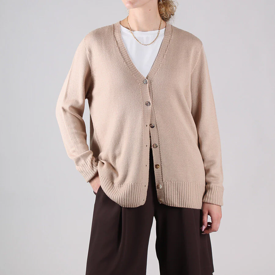 Cardigan in Lana Merinos, scollo a V e chiusura frontale con bottoni.100% Lana Merinos.Taglia unica, veste dalla 38 alla 46.Il cardigan è disponibile in Nero, Latte, Grano e Cacao.La modella è alta 170 cm e pesa 52 kg.Il prodotto può essere lavato in lavatrice come delicato a massimo 30°. Stirare con ferro tiepido.Lavare separatamente.Prodotto in Italia, distribuito da Vaso srl.