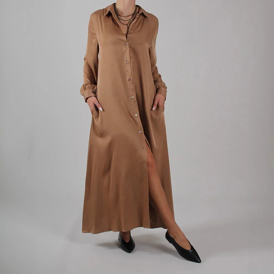 Abito lungo modello chemisier in raso, chiusura frontale con bottoncini su tutta la lunghezza.
