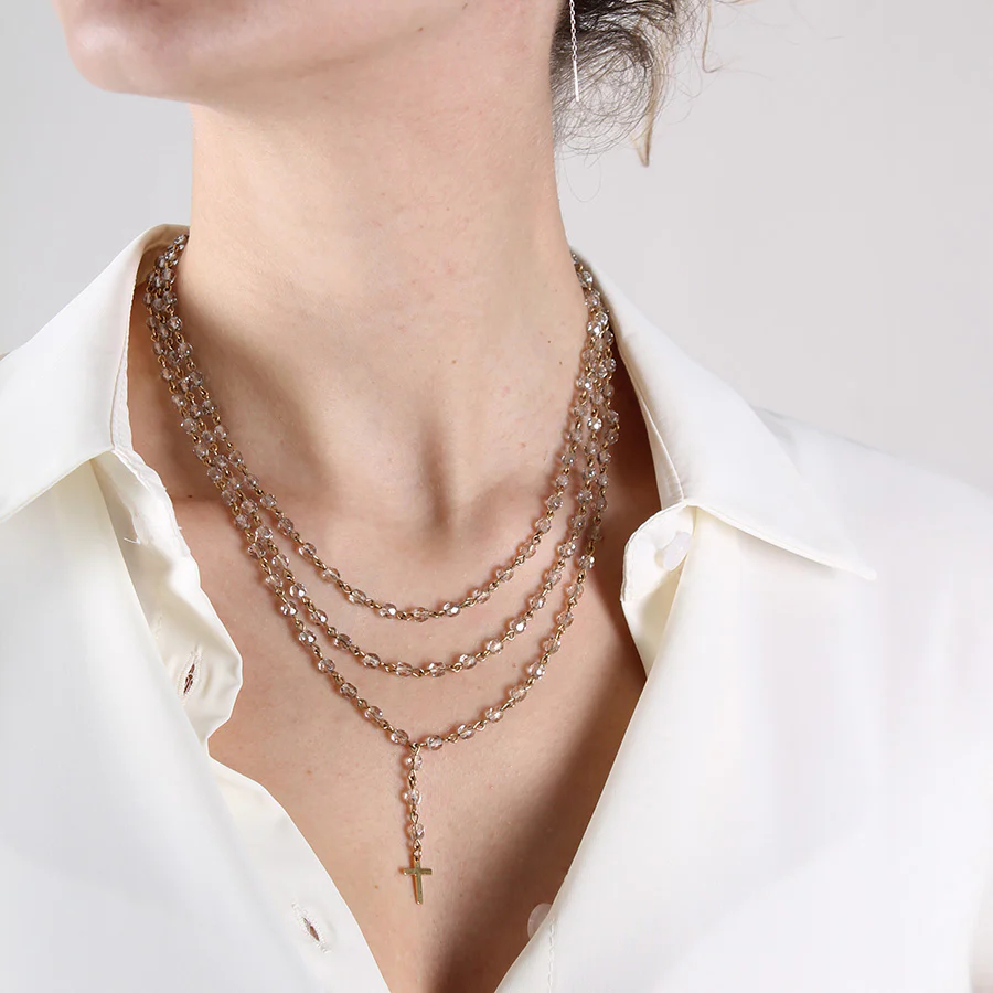 Collana girocollo tre fili, con cristalli 4mm.Ciondolino a croce in alluminio. Chiusura a moschettone in acciaio. Lunghezza 26cm.Fatte a mano in Italia da Momi, distribuito da Vaso. In ottemperanza al DL 206 del 6/9/2005 si comunica che i prodotti a marchio Momi sono prodotti in Italia, nel pieno rispetto delle normative vigenti: Realizzati in acciaio, alluminio, cristalli, resine acquistati e lavorati da aziende italiane, sono esenti da nichel, piombo e cadmio, conformemente alle leggi italiane vigenti in materia..