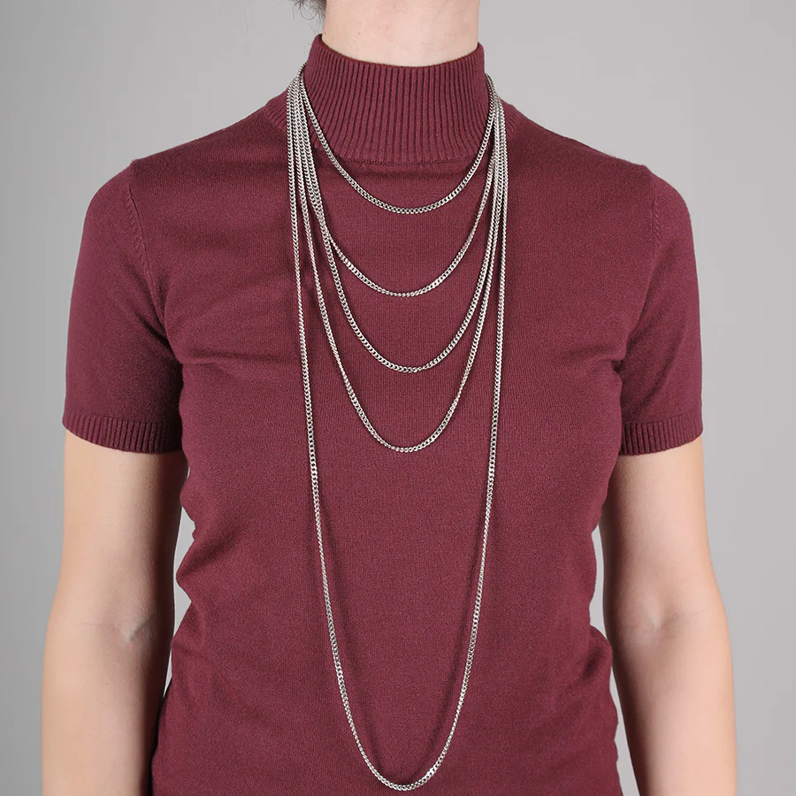 Collana in alluminio a maglie sottili con 3 catene. Chiusura con moschettone in alluminio. Fatto a mano in Italia da Momi, distribuito da Vaso. In ottemperanza al DL 206 del 6/9/2005 si comunica che i prodotti a marchio Momi sono prodotti in Italia, nel pieno rispetto delle normative vigenti: Realizzati in acciaio, alluminio, cristalli, resine acquistati e lavorati da aziende italiane, sono esenti da nichel, piombo e cadmio, conformemente alle leggi italiane vigenti in materia.