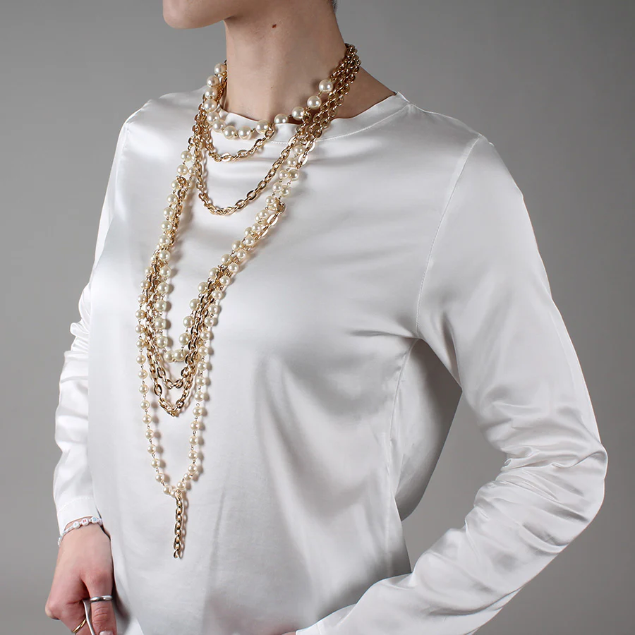 Collana multi fili dal design sofisticato, caratterizzata da un elegante alternanza di perle e catena in alluminio, che crea un perfetto equilibrio tra classicismo e modernità.