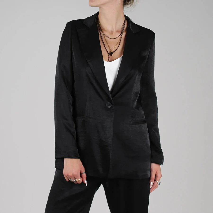 Giacca in raso di viscosa monopetto effetto satinato. Linea classica con revers e chiusura con bottone.