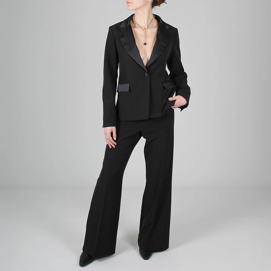 Giacca monopetto con reverse e patta in raso lucido. Manica lunga con bottoni decorativi in tono.