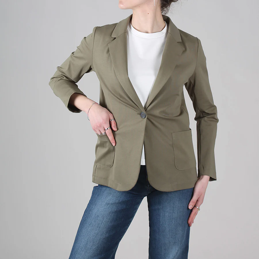 Giacca in cotone elasticizzato, modello monopetto, chiusura con bottone e tasche applicate frontali. Realizzata in tessuto leggero e confortevole.