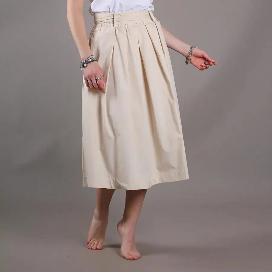 La gonna ha un taglio ampio e strutturato, caratterizzata da pieghe che donano movimento. Ha l'elastico in vita e cintura in cotone da annodare.
