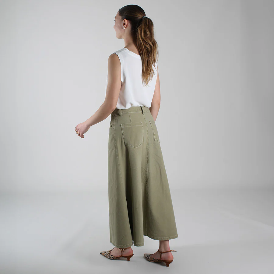 Gonna lunga in denim, linea ampia e svasata. chiusura con bottone e zip, passanti per cintura, tasche laterali e sul retro. Vita regolare.