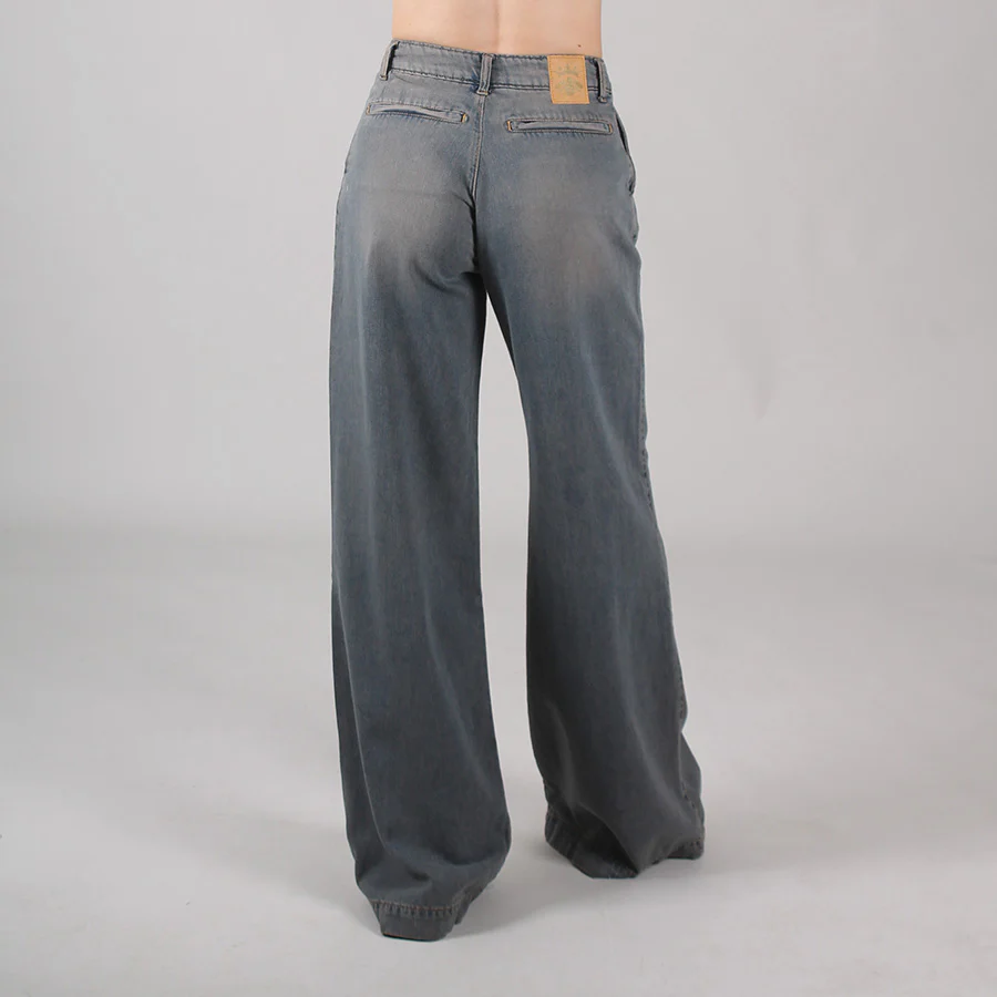 Jeans Cesare caratterizzato da vita asciutta e gamba palazzo. Tasche anteriori alla francese e tasche posteriori a filetto. Realizzato in denim estremamente morbido, con lavaggio effetto vintage dal tono grigio trattato.