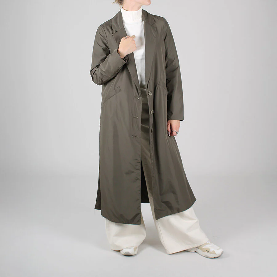Piumino lungo con chiusura frontale con bottoni, tasche apribili e spacchi laterali..