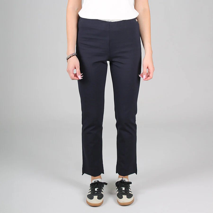 Gamba dritta e slim con spacchetti sul fondo. Elastico in vita