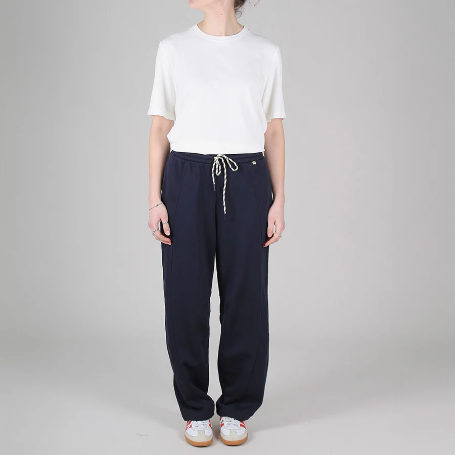 Pantalone in felpa garzata dalla linea morbida, con elastico in vita e coulisse. Le cuciture a vista valorizzano il fit.