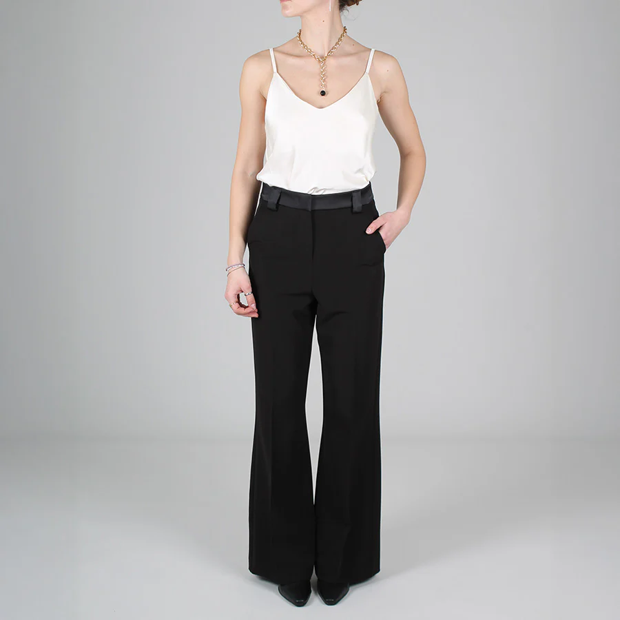 Pantalone elegante a gamba dritta. Chiusura con bottone e zip, fascia in vita e passanti per cintura in raso lucido.