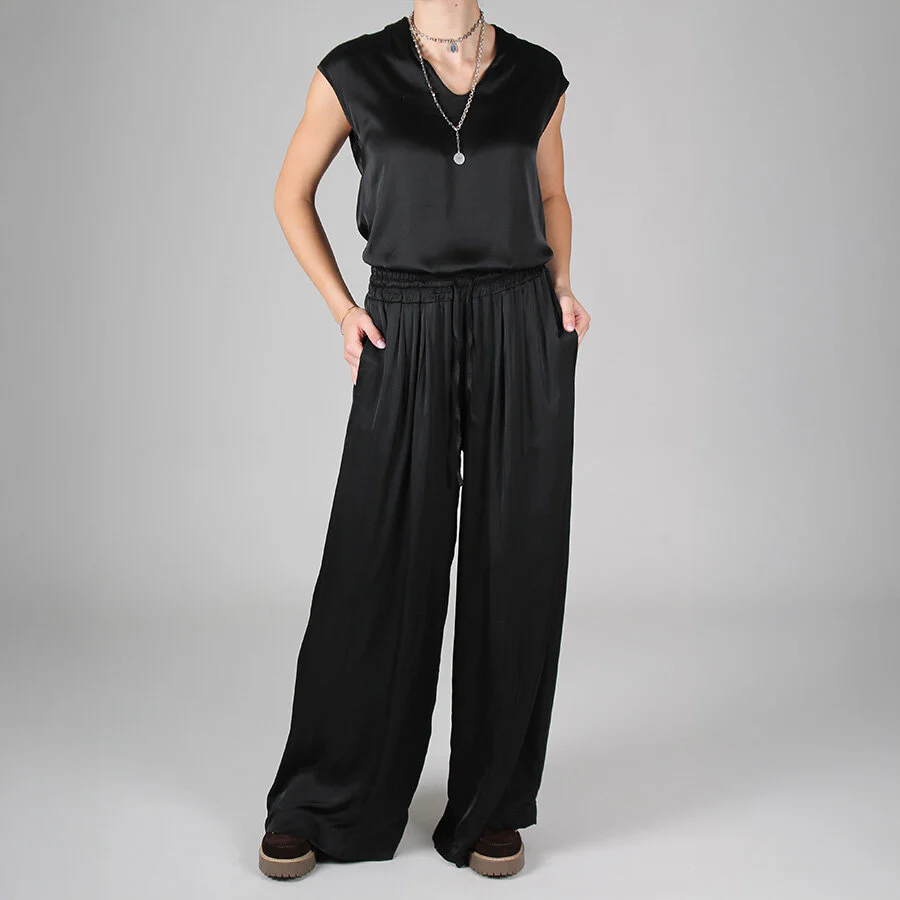 Pantalone a palazzo, con tasche laterali.Elastico in vita e laccio regolabile.97% Viscosa 3% Elastan.