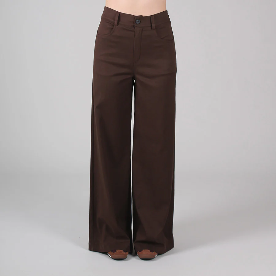 Vita alta con elastico sul retro e davanti liscio con chiusura a bottone e cerniera. Tasche anteriori stile jeans e tasche posteriori applicate. Tessuto fresco ed elasticizzato.