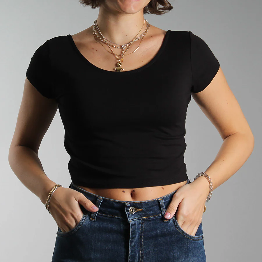 Tee in viscosa con scollo rotondo .Taglia unica, veste dalla 38 alla 44.Prodotto in Italia, distribuito da VASO.