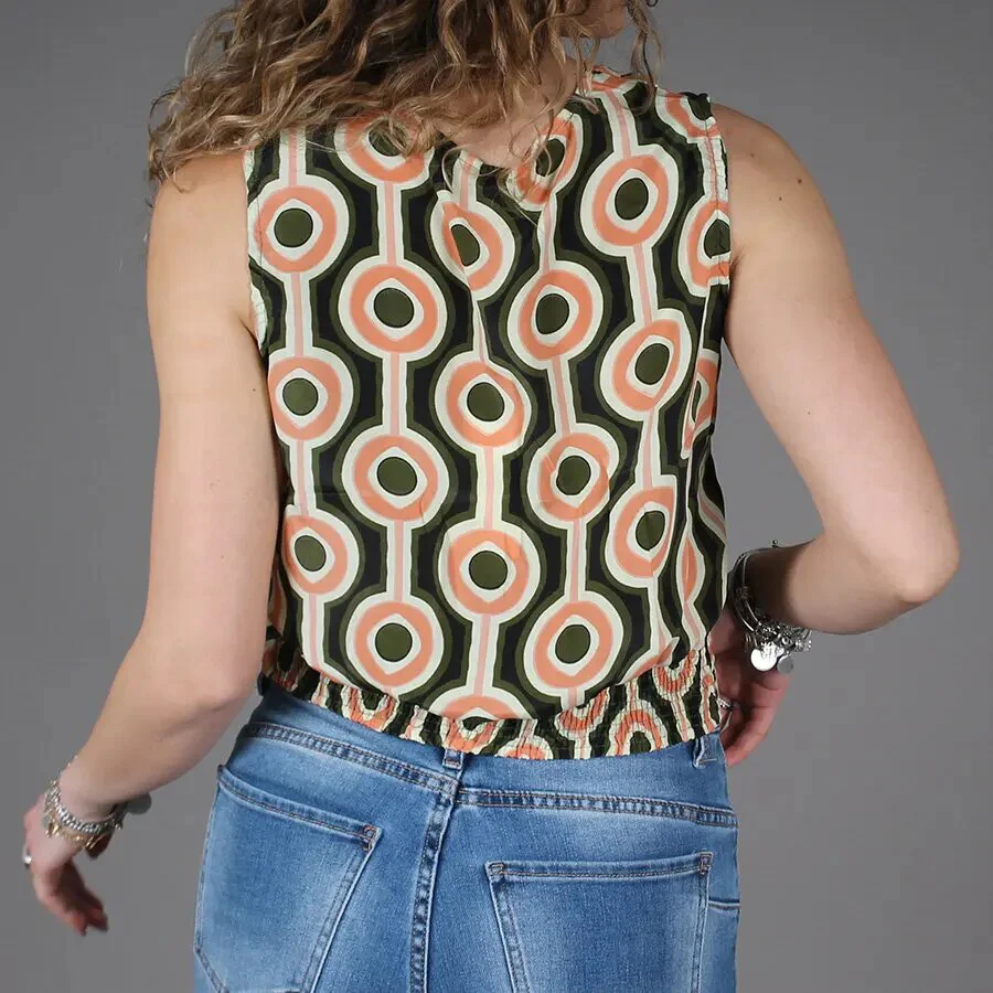 Top in seta pregiata con spalla larga e scollo a V, impreziosita da una fantasia esclusiva.